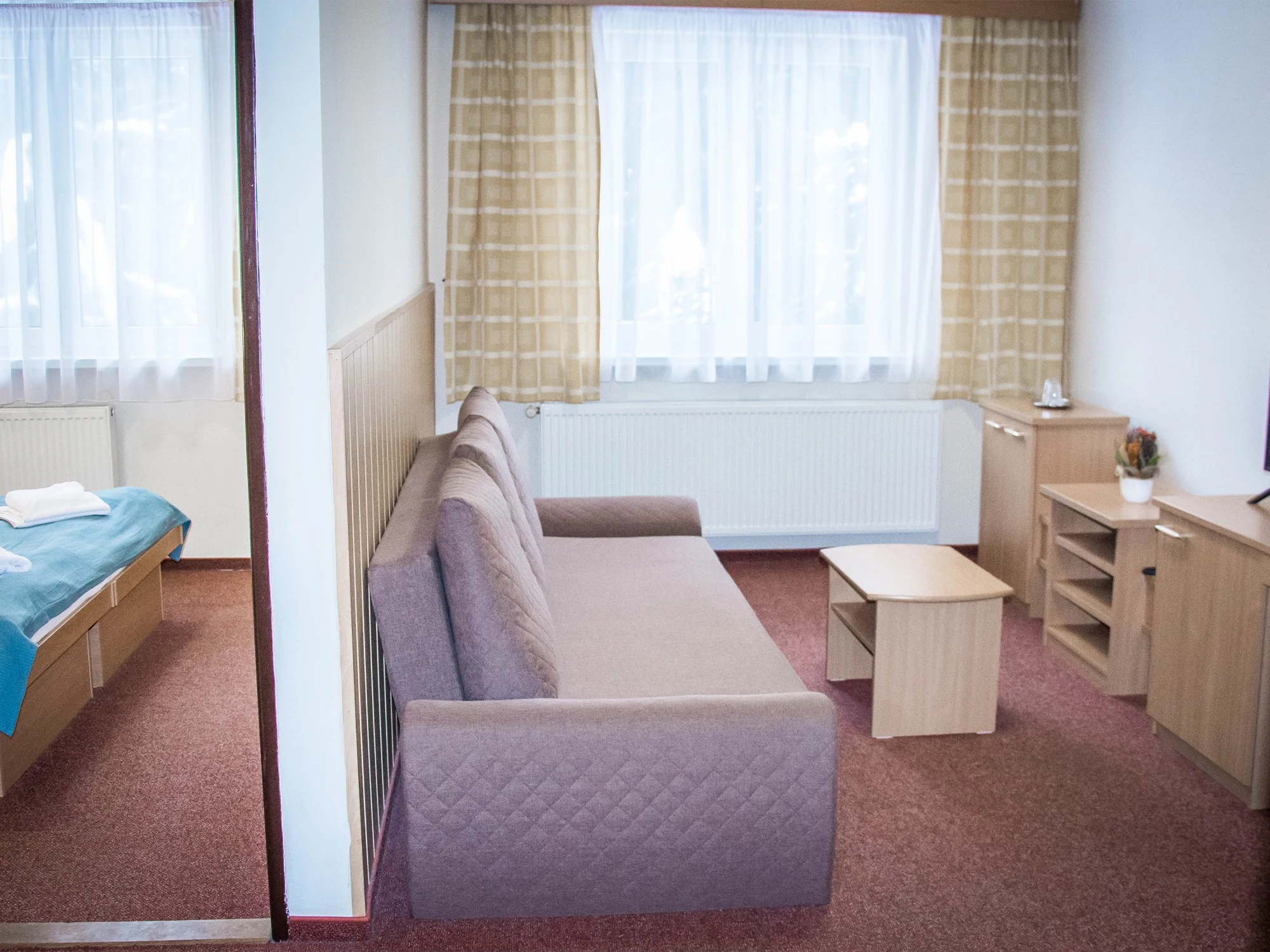 Apartmán 2+2 so samostatnou spálňou s manželskou posteľou a obývacou miestnosťou, ktorá disponuje rozkladacím gaučom, čo je plnohodnotné lôžko pre 2 osoby, je skvelou voľbou pre rodiny s deťmi, prípadne pre hostí, ktorí hľadajú nadštandardný typ ubytovania. Apartmán je vhodný aj pre 4 dospelé osoby. Apartmány sú orientované na južnú stranu, dva z nich majú výhľad na jazierko s fontánou.